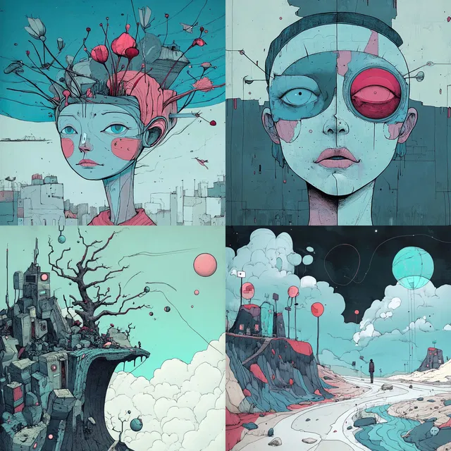 Доминируют сюрреализм и причудливость. Приглушённый бирюзовый и нежно-розовый цвета создают сказочную атмосферу. Замысловатые линии и детальные текстуры определяют стиль, создавая эфемерные образы и завораживающие взгляды.