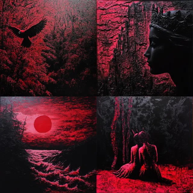 Для этого стиля характерно поразительное сочетание текстурной глубины и драматического освещения. Используется однотонная красно-чёрная палитра. Сюрреалистичные элементы и резкие контрасты создают напряжённую, загадочную атмосферу в различных темах — от футуристической биоархитектуры до рыцарей в стиле ретропанк.