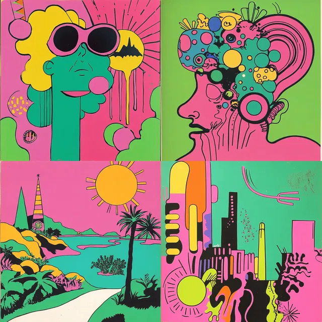 Доминируют яркие неоновые цвета, сочетающие в себе влияние поп-арта, смелые контуры и упрощённые формы. Стиль процветает за счёт графического повторения и психоделических мотивов, создавая энергичный и динамичный визуальный язык. Он отлично подходит для ретрофутуристических и причудливых тем, передавая игривую сущность эстетики 1960-х годов. Однако использование плоских цветов и стилизованных форм может ограничить его применение в фотореалистичном дизайне.