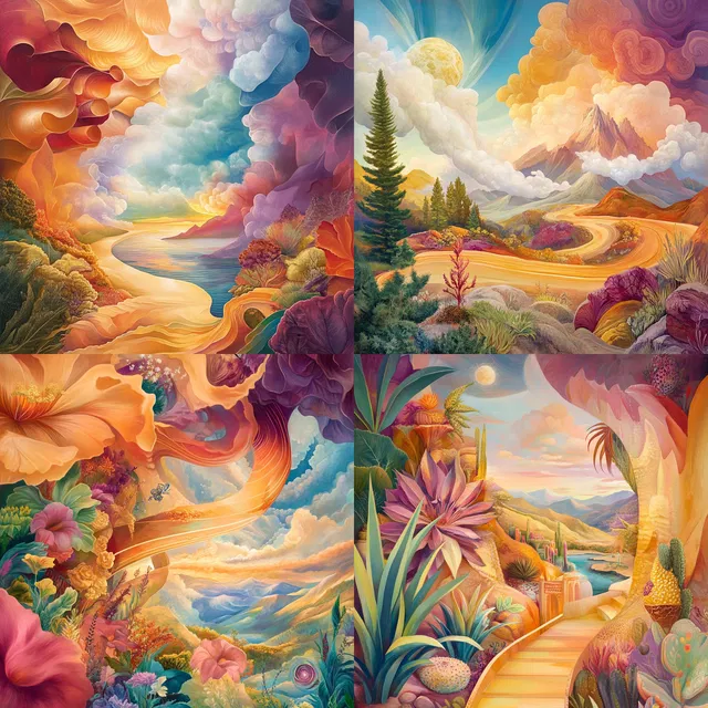 Яркие краски и сказочные композиции преобладают, создавая сюрреалистические пейзажи, наполненные органическими формами и воздушными текстурами. Стиль отличается гармоничным сочетанием цветов и форм, вызывая мистическую атмосферу, напоминающую модерн и символизм. Хотя его сильная сторона — способность создавать чарующие, потусторонние сцены, ему может быть сложно с фотореализмом и точным техническим изображением.