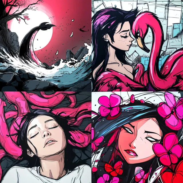 Динамичные композиции и смелые линии преобладают, создавая энергичный и яркий визуальный стиль. Яркие розовые и красные цвета наполняют изображения живой атмосферой, а выразительные линии и высокий контраст усиливают графичность. Этот стиль отлично передаёт динамику движения и игривых персонажей, что делает его идеальным для графических романов, редакционных иллюстраций и модного дизайна. Однако его яркость может затмить более тонкие темы, ограничивая применение в более нюансированных или фотореалистичных контекстах.