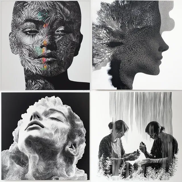 Этот стиль характеризуется сложной линейной работой и монохромной палитрой. Детальные узоры и текстуры создают поразительный визуальный эффект. Стиль отличается мастерством в создании оптических иллюзий и динамичных композиций, напоминая направления оп-арт и кинетическое искусство.