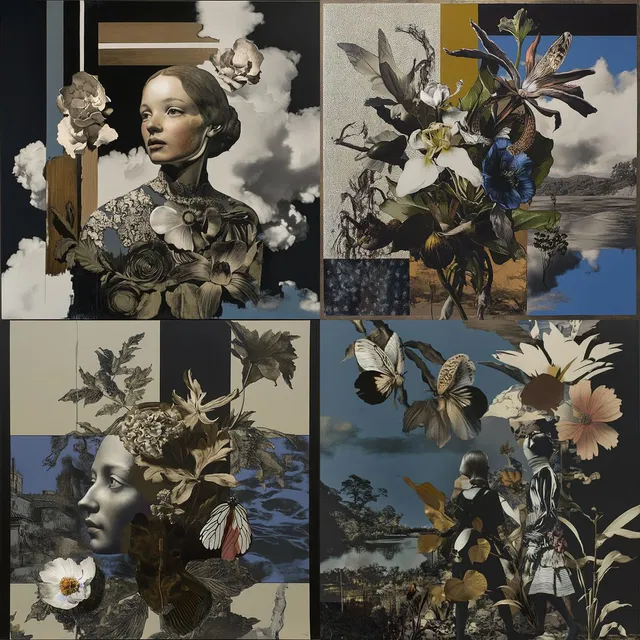 Этот стиль объединяет в себе сюрреализм и коллаж, сплетая разрозненные элементы в единый сказочный пейзаж. Использование приглушённых цветов создаёт мягкую, неземную атмосферу, а сложные наслоения и геометрические структуры придают ощущение глубины и сложности.