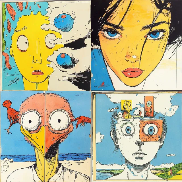 Абстракция в стиле Vivid Comic отличается смелым использованием чётких контуров и ярких цветов, что создаёт графическое и иллюстративное качество, напоминающее комиксы и поп-арт. В этом стиле применяются геометрические формы и абстрактные фигуры, часто с элементами сюрреализма и причудливости.
