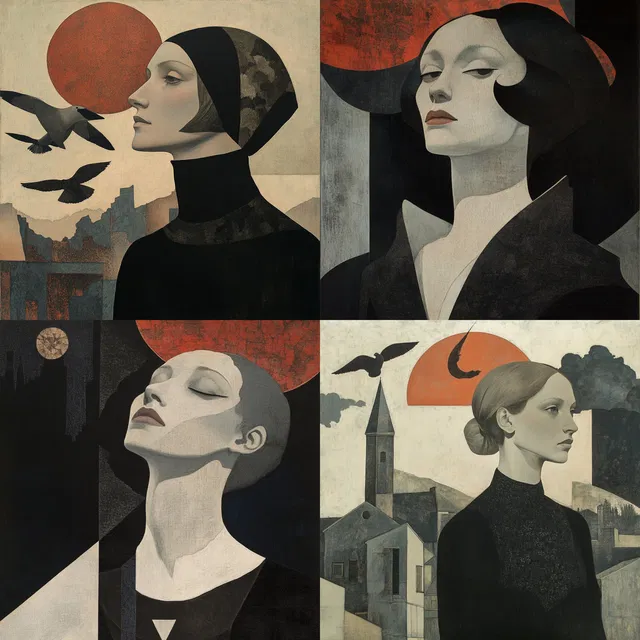 Угловатые формы и упрощённые очертания доминируют, создавая визуально поразительную, но в то же время созерцательную атмосферу. Монохромные и землистые тона придают композициям мрачное, интроспективное настроение, а чёткие линии и геометрическая ясность создают ощущение структурной целостности.
