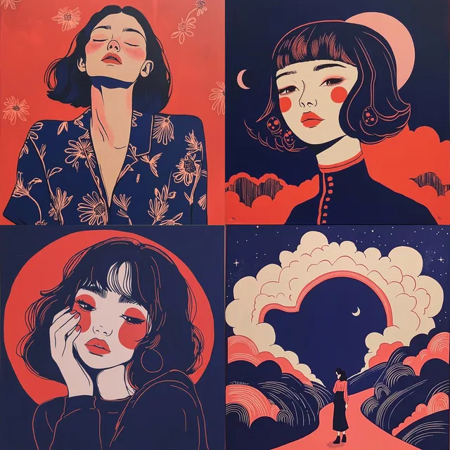 Этот яркий и смелый стиль основан на сочетании кораллового и тёмно-синего цветов, что создаёт поразительный визуальный эффект. Его графический стиль, отличающийся чёткими контурами и плоскими цветами, подходит для разных целей — от редакционного дизайна до модного брендинга. Игривая геометрия и абстрактные формы особенно эффективны для создания творческих и сюрреалистичных композиций.