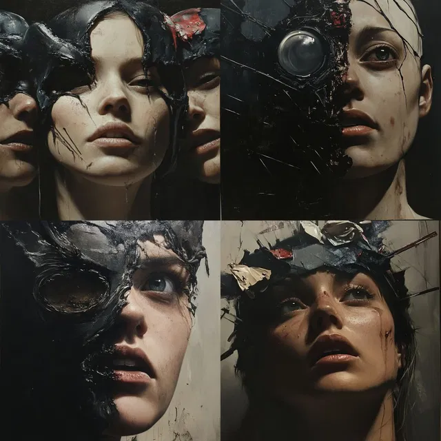 Тёмный кинематографический сюрреализм — это гиперреалистичная, но в то же время сказочная эстетика, в которой напряжённая драма сочетается со сложными деталями. В этом стиле преобладают мрачная атмосфера и яркие текстуры. Он отлично подходит для изображения человеческих фигур и футуристических пейзажей с сюрреалистическим уклоном.