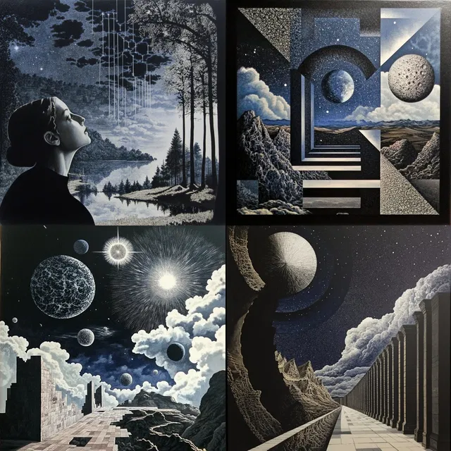 Цветовая палитра основана на монохромных тонах с космическим синим и неземным белым, что усиливает мистическое восприятие. Стиль отлично подходит для создания сюрреалистических пейзажей и космических историй, но может не обладать фотореализмом в более реалистичных контекстах.