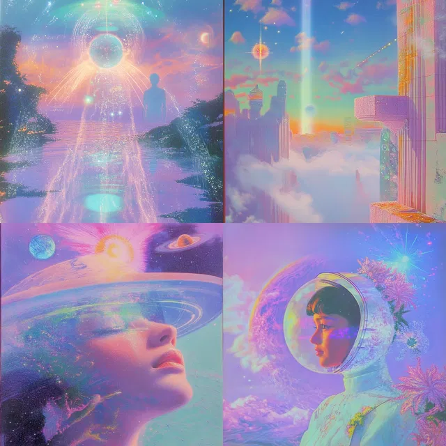 Этот стиль очаровывает своими переливающимися цветами и мерцающими текстурами, создавая космическую атмосферу, которая кажется нереальной и потусторонней. Пастельные оттенки и небесные мотивы наполняют каждое произведение чувством удивления и фантазии. Благодаря этому стиль идеально подходит для иллюстраций в жанре научной фантастики и фэнтези, модной фотосъёмки и брендинга.