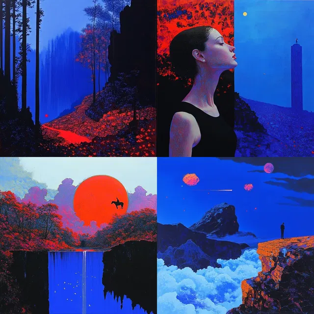 Доминируют яркие синие и глубокие красные тона, которые создают сюрреалистичную и сказочную атмосферу. Контрастные сочетания и космические элементы придают мистическую ауру, а замысловатые детали и многослойные текстуры усиливают загадочность композиций. Этот стиль превосходно подходит для создания неземных и потусторонних образов, что делает его идеальным для обложек книг, оформления альбомов и концепт-арта. Однако его сюрреалистичная природа может ограничивать эффективность в фотореалистичных или технических контекстах.