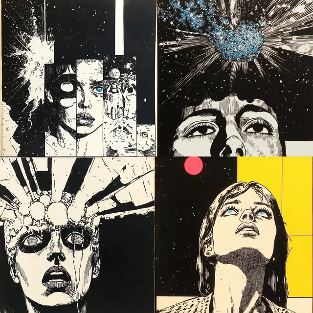 Контрасты и сложные линии определяют визуальный стиль, вплетая космические темы и сюрреалистические сюжеты в монохромную палитру. Этот стиль отличается выразительностью в графическом повествовании: текстурная насыщенность и выразительные линии создают динамичную игру света и тени.