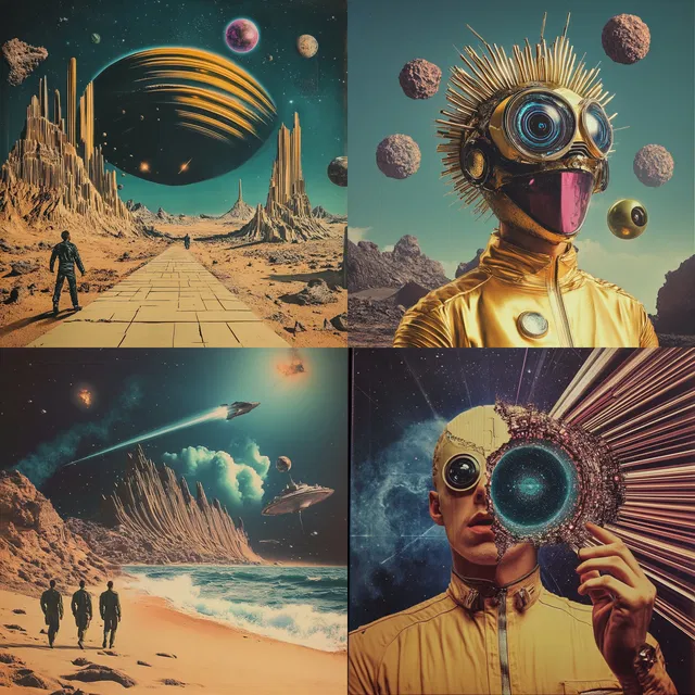 Этот стиль — завораживающее сочетание сюрреализма и футуризма. Он прекрасно подходит для создания воздушных пейзажей и космических сюжетов. В нём преобладают металлические текстуры и сказочные композиции, которые формируют уникальный визуальный язык, сочетающий научно-фантастическую эстетику с сюрреалистическими мотивами.