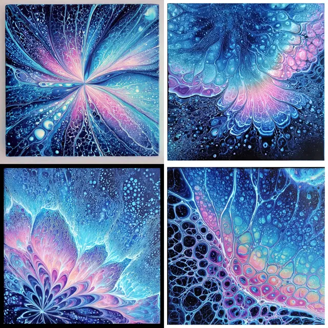 Здесь преобладают яркие оттенки синего и призрачные розовые тона, которые создают психоделическую и визионерскую эстетику. Органические формы и клеточные текстуры вызывают ощущение космической и сюрреалистичной атмосферы, а биолюминесцентное свечение добавляет потусторонний штрих.