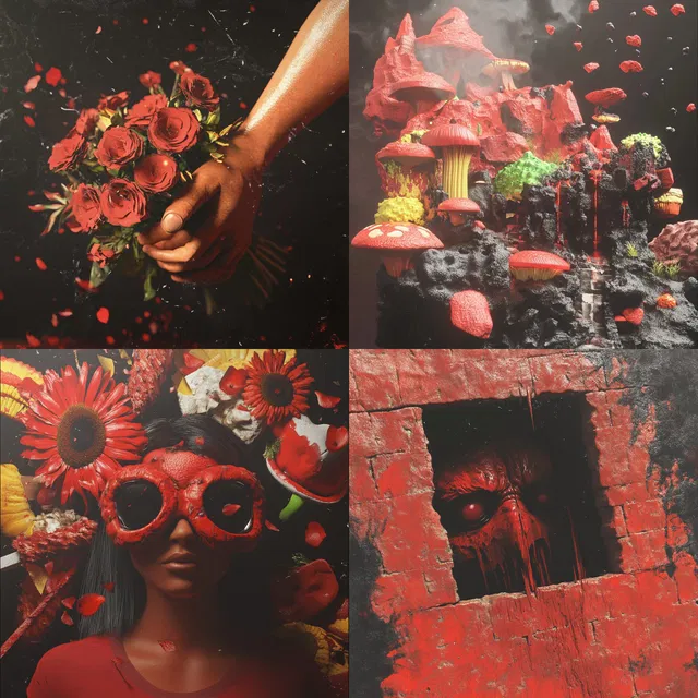 В этом визуальном стиле ярко выражено взаимодействие красного и чёрного цветов, которое проходит через каждый образец с дерзкой интенсивностью. Характерными чертами являются текстурное богатство и многослойная сложность, которые создают яркое повествование, охватывающее жанры от футуристической архитектуры до волшебных сказок.