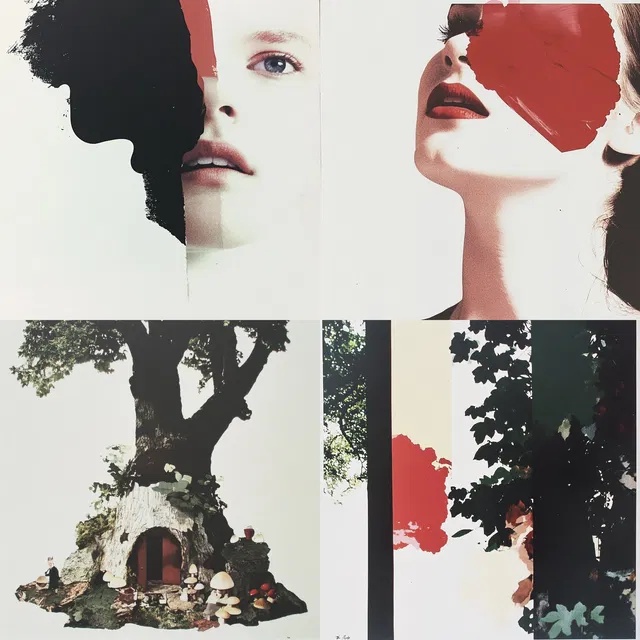 В этом стиле ярко выражено взаимодействие эстетики коллажа и минималистичной абстракции. Смелые контрасты и геометрическая точность используются для создания визуально захватывающих композиций. Применение красных акцентов и монохромных контрастов добавляет динамическое напряжение, а многослойные текстуры придают глубину и насыщенность.