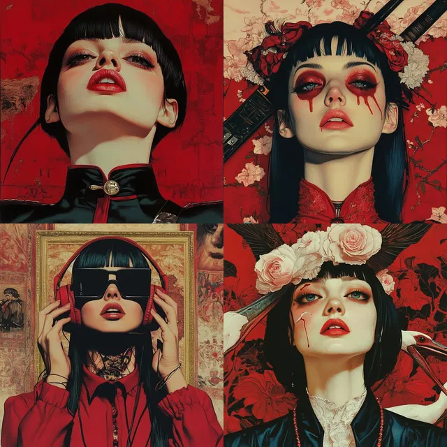 Этот стиль отличается смелой и яркой цветовой палитрой. В нём особенно выразительно используются красный и чёрный цвета, что создаёт драматическое и интенсивное визуальное впечатление.