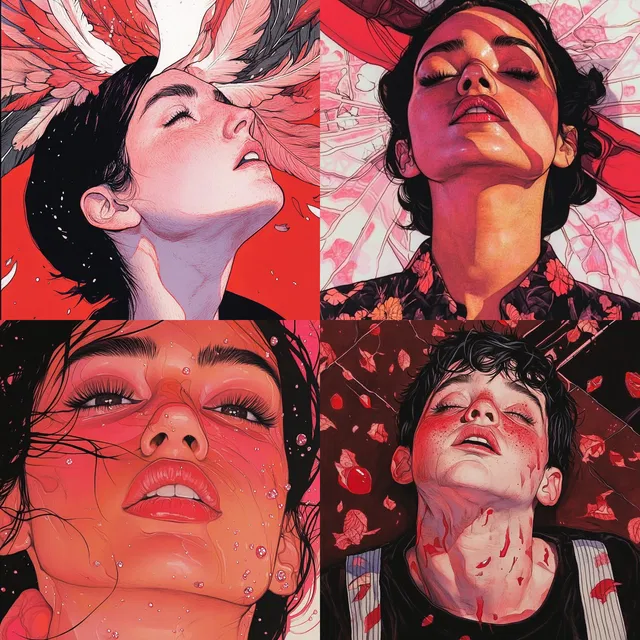 Этот стиль отличается яркими насыщенными цветами и динамичными композициями. Для него характерны выразительные линии и эмоциональный рисунок. Использование ярких красных и насыщенных розовых цветов создаёт поразительный визуальный эффект, а замысловатые линии добавляют глубину и сложность.