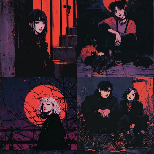 Этот стиль — поразительное сочетание киберпанка и готики. Он завораживает насыщенным графическим повествованием и драматическими контрастами. Преобладание ярко-алой и чёрной палитры создаёт повествование, насыщенное эмоциональной глубиной и атмосферным напряжением. Текстурная сложность и замысловатые детали формируют визуальную глубину, которая вовлекает зрителя в антиутопический мир.