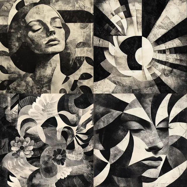 Смело играя на контрасте чёрного и белого, этот стиль сочетает геометрическую абстракцию с влиянием кубизма, создавая визуально захватывающее повествование. Игра света и тени придаёт глубину и динамичность, а текстурированные поверхности вызывают ощущение тактильности.