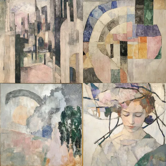 Этот визуальный стиль отличается влиянием кубизма и геометрии. Он использует абстрактные формы и многослойные текстуры, чтобы создать атмосферу, напоминающую сон. Пастельные и приглушённые цвета придают композициям мягкость и эфемерность, а фрагментарные элементы и приёмы, характерные для коллажей, добавляют глубину и интригу.