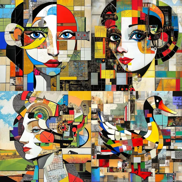 Этот стиль — яркий и динамичный. Он передаёт суть кубистической абстракции через геометрическую фрагментацию и наложение мозаичных слоёв. Использование насыщенных основных цветов и угловатых композиций создаёт атмосферу бодрости и энергии, напоминая модернистские течения начала XX века, такие как «Де Стейл» и «Баухаус».