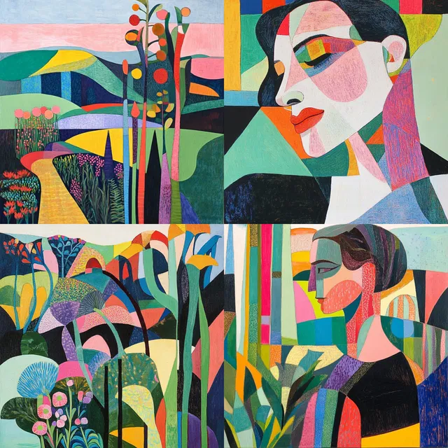 Этот стиль определяется яркой геометрической абстракцией с характерными чёткими цветами, угловатыми формами и влиянием кубизма. Многослойные композиции создают динамичные визуальные повествования, сочетая элементы модернизма и авангарда.