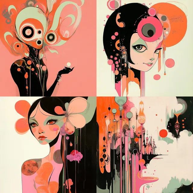 В этом стиле преобладают яркие цветовые палитры и закрученные органические формы, напоминающие об элегантности и текучести модерна. Использование круглых мотивов и криволинейных форм создаёт динамичную и игривую атмосферу, а смелые графические элементы добавляют поразительную интенсивность.