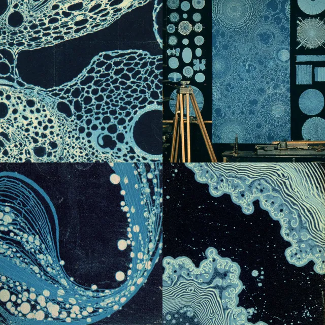 Монохромная синяя палитра, напоминающая цианотипию, создаёт атмосферу мечты, усиливая эфемерность и мистику изображений. Органические текстуры и плавные формы указывают на биофильное влияние, а детальная прорисовка линий и фактурные поверхности отсылают к таким художественным направлениям, как модерн и эстетика викторианской эпохи.