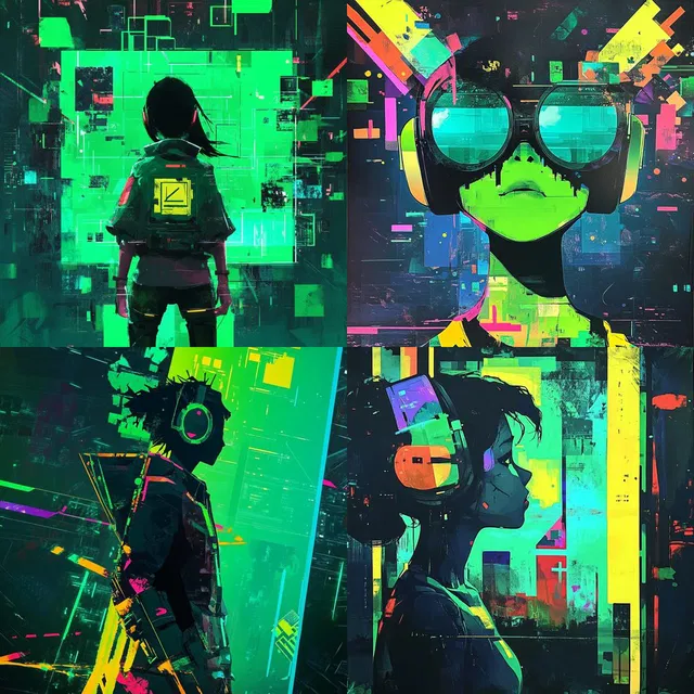 Ярко погружаясь в цифровой мир, этот стиль пестрит неоновыми цветами и геометрическими узорами, создавая захватывающую атмосферу киберпанка. В композициях преобладают абстрактные и футуристические элементы, сочетающие технологические мотивы с динамичными городскими пейзажами. Персонажи и строения изображены с сюрреалистической яркостью, подчёркивая инновации и киберкультуру.