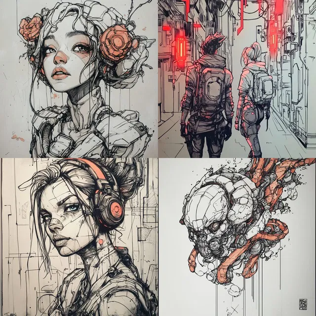 Динамичные линии и контрастные монохромные цвета определяют этот стиль, точно передавая суть кибернетических и футуристических тем. Замысловатые детали и выразительные образы персонажей создают атмосферу жёсткости и индустриальности, напоминая о классическом влиянии манги и аниме.