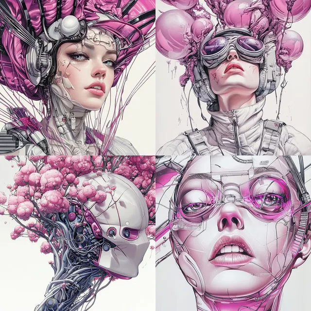 Кибернетическая элегантность очаровывает своим замысловатым изображением футуристических тем, плавно сочетая элементы человека и машины.