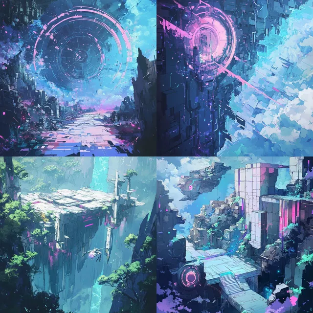 В композициях часто встречаются парящие конструкции и кибернетические персонажи, создающие сказочную, потустороннюю атмосферу. Геометрическая точность и цифровые текстуры усиливают научно-фантастический стиль, а призрачный свет добавляет мистическое качество.