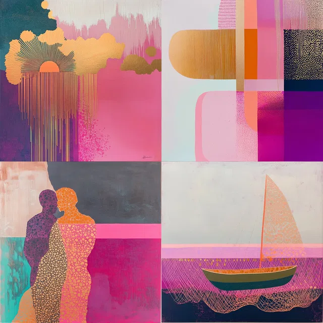 Этот стиль — яркое исследование цвета и формы. Он отличается гармоничным сочетанием геометрической абстракции с игривой элегантностью. В композициях преобладают ярко-розовый и тёплый оранжевый цвета. Их дополняют замысловатые текстуры и слоистые поверхности, создавая динамичную игру глубины и объёма.