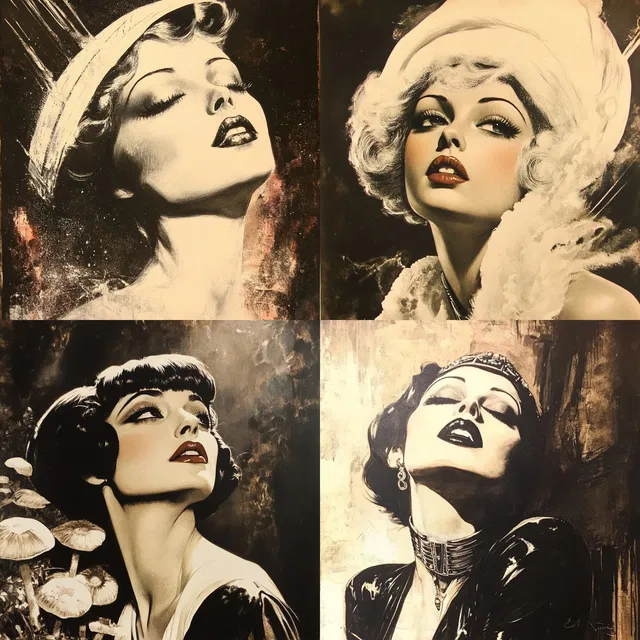 Сепиевые тона и высокий контраст усиливают ностальгическую атмосферу, а эффектные позы и кинематографические выражения создают образ классического голливудского очарования.