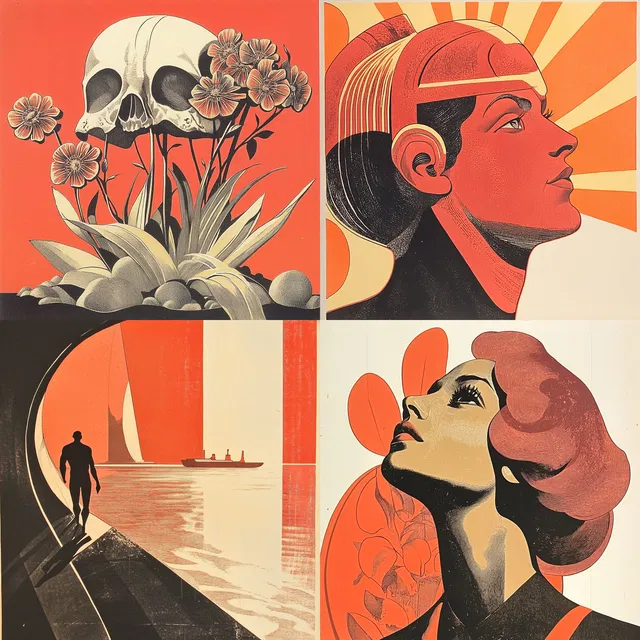 Смелый графический стиль, характеризующийся обтекаемыми геометрическими формами и ограниченной тёплой палитрой цветов. Заметно влияние ар-деко, проявляющееся в стилизованных симметричных композициях и декоративных деталях.