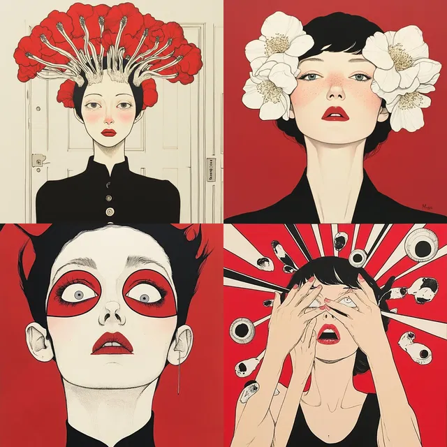 Монохромная палитра с яркими красными акцентами создаёт смелый визуальный эффект. Выразительные линии и декоративность усиливают глубину повествования.