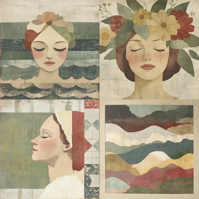Текстурированные поверхности и многослойные цвета создают ностальгическое, винтажное ощущение, а использование упрощённых форм и структурированных композиций рождает чувство баланса и гармонии.