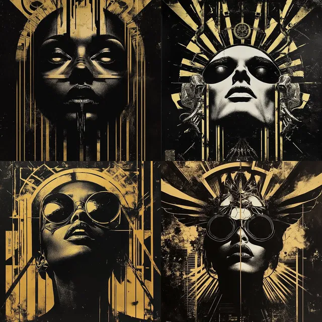 Этот стиль — удивительное сочетание эстетики ар-деко и киберпанка. Его отличает использование монохромной палитры с яркими золотыми акцентами, создающими высококонтрастное визуальное впечатление. В дизайне преобладают геометрическая точность и угловатость, что придаёт ощущение структурного баланса и симметрии.