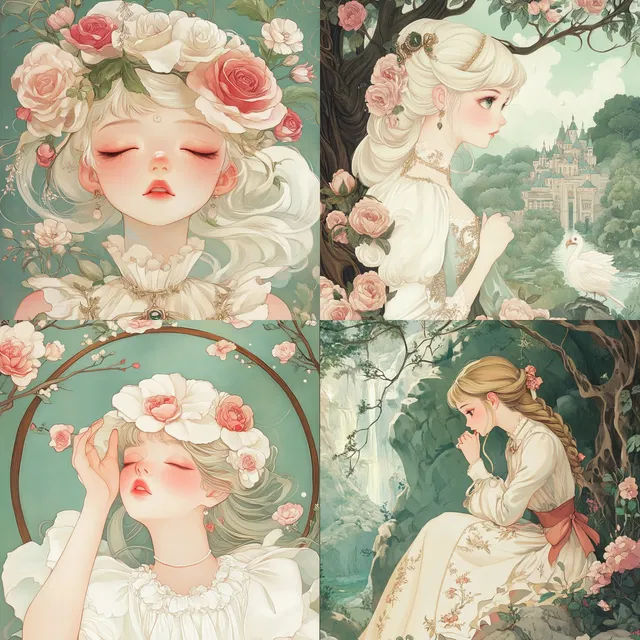 Этот стиль очаровывает своими изящными линиями и пастельными оттенками, создавая спокойную и сказочную атмосферу. В сложных деталях и мягких градиентах прослеживается влияние модерна и романтизма, что позволяет достичь гармоничного сочетания органических форм и цветочных мотивов.