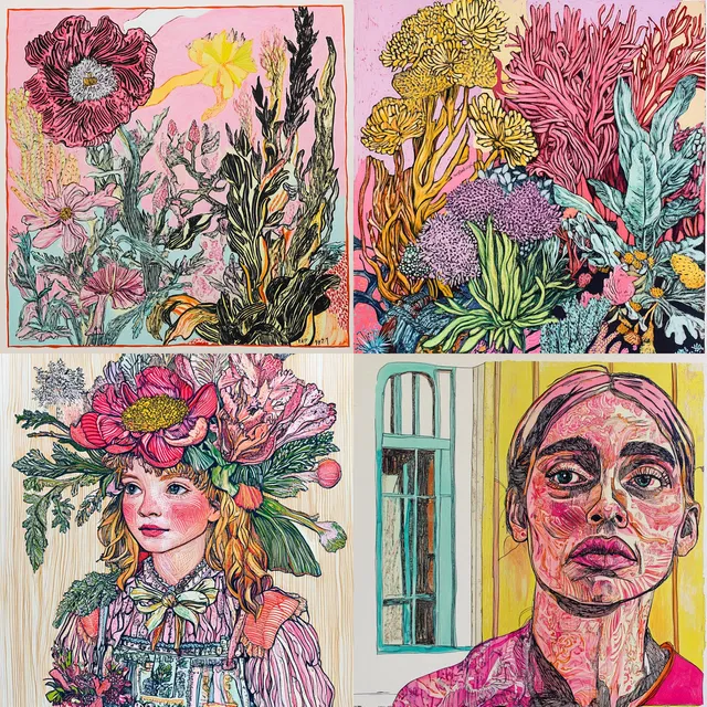 Применение смелых оттенков и динамичных мазков в различных темах — от высокой моды до ретроиллюстраций в стиле сказок — демонстрирует универсальность стиля. Однако склонность к яркости может затмить более тонкие элементы, ограничивая эффективность в фотореалистичном или минималистичном контексте.