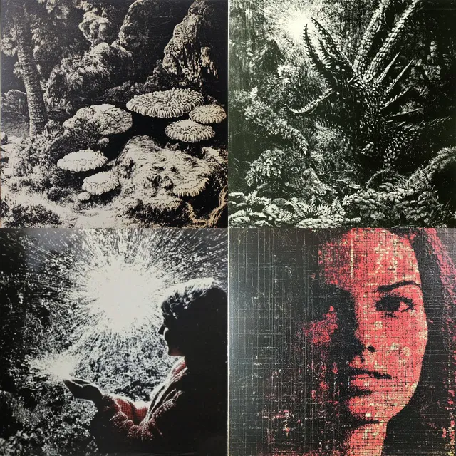 Этот визуальный стиль отличает поразительное сочетание полутоновых узоров и монохромных контрастов, вызывающее чувство ностальгии и футуризма одновременно. Сложные техники матричной раскладки точек и штриховки создают богатую текстурную сложность, влекущую зрителя в мир, где геометрическая абстракция встречается с органическими формами.