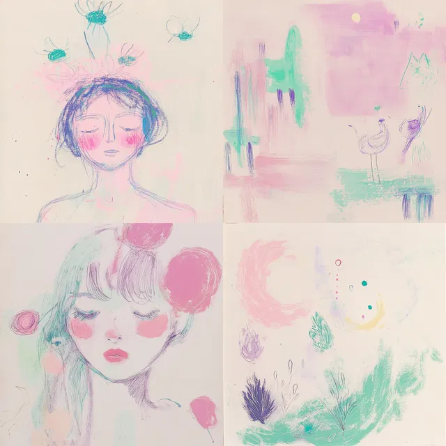 Мягкие пастельные тона и воздушная манера письма определяют этот стиль, создавая сказочную атмосферу в различных темах. Плавные переходы и нежные текстуры вызывают ощущение причудливости и невинности, напоминая наивное искусство и пастельный импрессионизм.