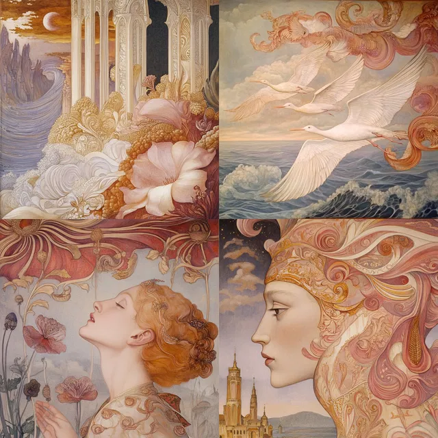Этот стиль отлично подходит для книжной иллюстрации, дизайна одежды и декоративного искусства, предлагая причудливое, но утончённое визуальное повествование. Однако ему может не хватать фотореализма в тех контекстах, где требуется точный реализм. Вместо этого он склоняется к более иллюстративному, декоративному подходу.