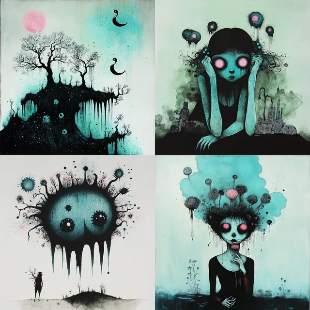 Этот стиль очаровывает своей воздушной цветовой палитрой и сказочными композициями. Органичные формы и замысловатые детали создают плавное визуальное повествование, напоминающее о влиянии готики и сюрреализма. Использование небесно-бирюзового и сказочно-розового цветов на фоне сюрреалистичного чёрного создаёт поразительный контраст, усиливая причудливое и загадочное настроение.