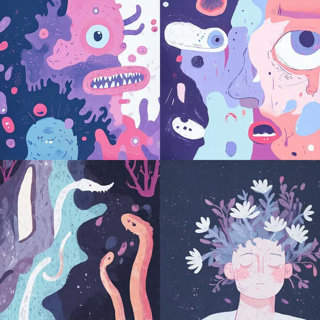 Этот стиль характеризуется причудливой абстрактностью и игривым искажением. В нём преобладают упрощённые формы и минималистичные очертания, которые подчёркиваются пастельной палитрой мягких оттенков. Заметно влияние современной иллюстрации: композиции наполнены сюрреалистическими существами и сказочными персонажами. Основные темы — прихоть и игривость, которые поддерживаются плоской штриховкой и плавными градиентами. Хотя этот стиль отлично подходит для творческих и лёгких по настроению проектов, ему может не хватать глубины в более серьёзных или фотореалистичных приложениях.