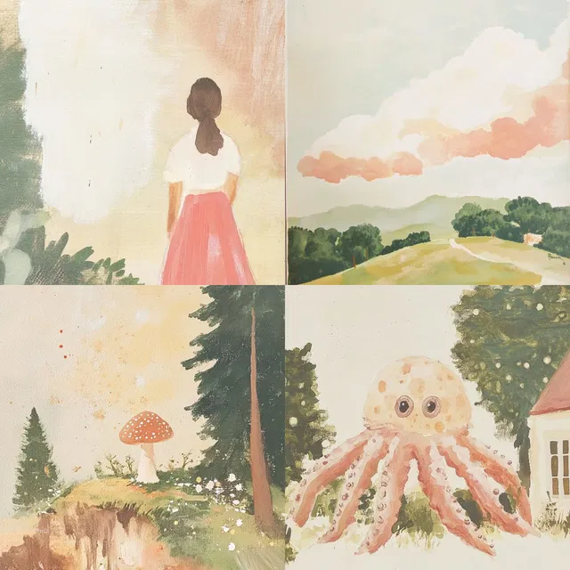 Пастельные пейзажи мечты передают лёгкость и воздушность с помощью мягких, приглушённых цветов и нежных акварельных техник. Композиции часто минималистичны, но при этом детализированы, они передают ощущение причудливости и ностальгии. Стиль склоняется к импрессионистическим влияниям с акцентом на природу, фантастику и спокойные сцены.