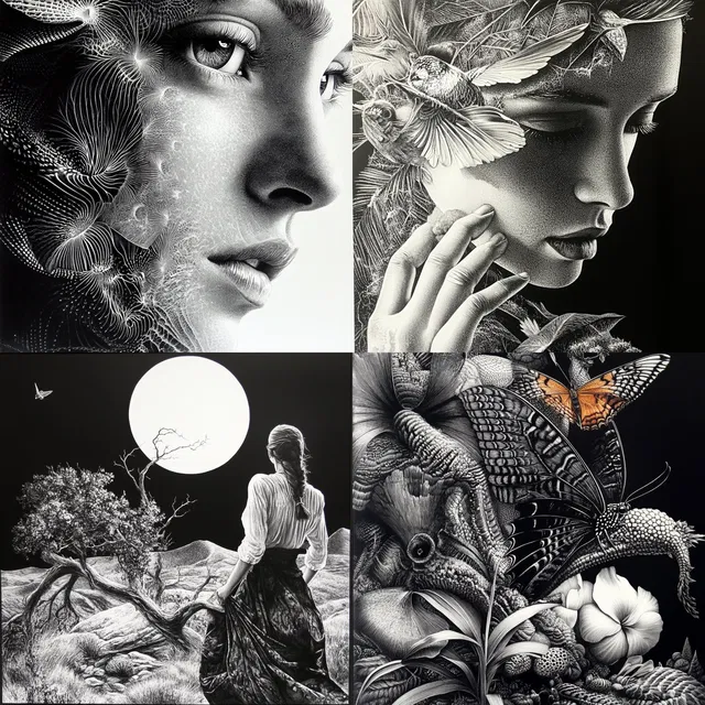 Этот стиль отличается сложной детализацией и текстурным богатством, создавая сюрреалистичное и выразительное визуальное повествование. Монохромные палитры с высокой контрастностью усиливают драматизм композиций. Замысловатые линии и сложные узоры вызывают ощущение глубины и движения.