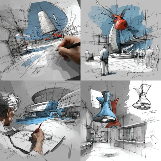 Взаимодействие красных и синих акцентов на монохромном фоне создаёт яркий визуальный контраст, подчёркивая архитектурные и концептуальные элементы.