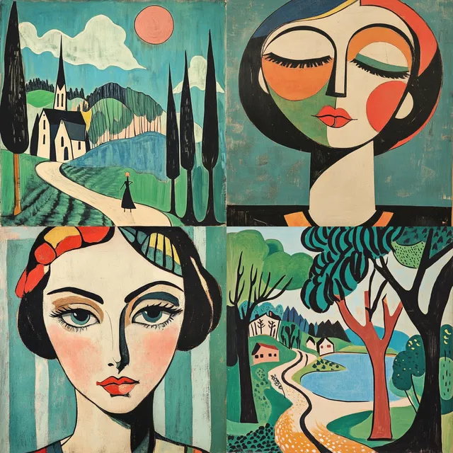 Динамичное взаимодействие геометрических форм и чётких контуров определяет этот стиль, перекликаясь с кубистическими и модернистскими течениями XX века. Использование плоских цветов и стилизованных фигур создаёт особый визуальный язык, одновременно игривый и изысканный.