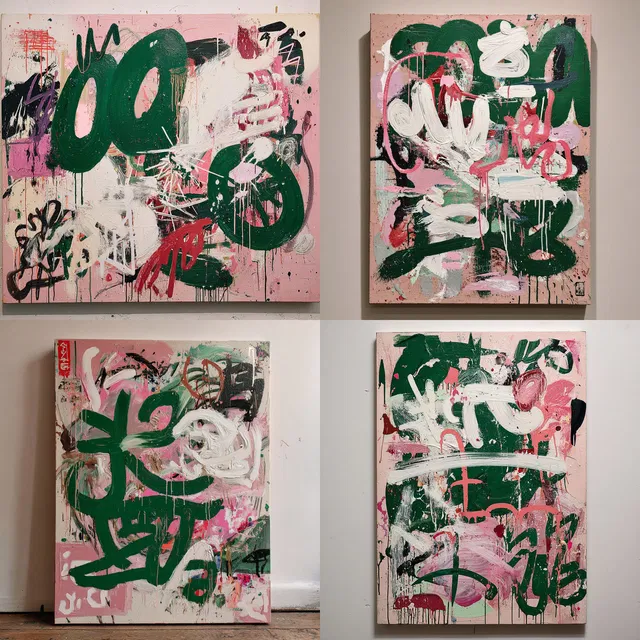 Динамичные визуальные образы в стиле граффити доминируют благодаря чётким линиям, многослойным текстурам и ярким цветам. Этот стиль прекрасно передаёт эстетику городского и уличного искусства, проводя параллели с творчеством Баскии и Харинга. Энергичные композиции и выразительные формы создают живую, современную атмосферу.